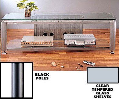 Simplify and modernize your entertainment component stand with this powerful Audio Visual Stand with 2 Tempered Glass Shelves - a look that brings sleek class and stunning efficiency to any decor. It features a beautiful heavy gauge steel frame with powerful tempered glass shelves -- extra strong to accommodate all kinds of equipment. Perfect for up to 60" DLP, Plasma or LCD TVs Clearance between shelving 12", 9", and 9" (from bottom) The total weight capacity of this unit is 300 pounds Dual wire management systems with separate power supply cord and signal wiring accommodations Adjustable leveling feet for balancing and all flooring needs Available with a Black Metal Frame. Assembly level/degree of difficulty: Easy. Made in America